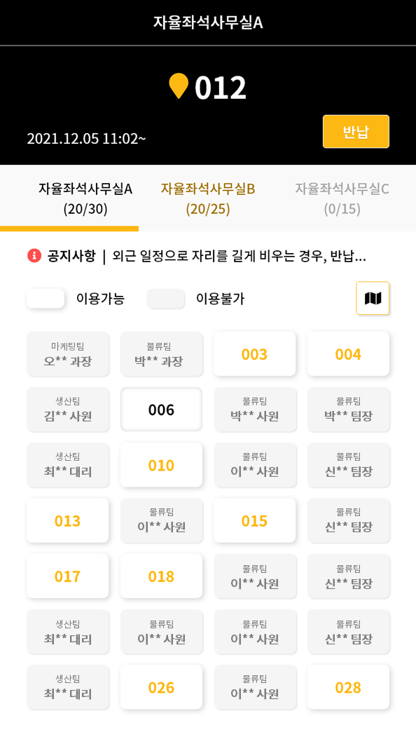 도면과 동일하게 현재 좌석 점유현황 및 팀원들의 좌석 등을 확인할 수 있습니다.