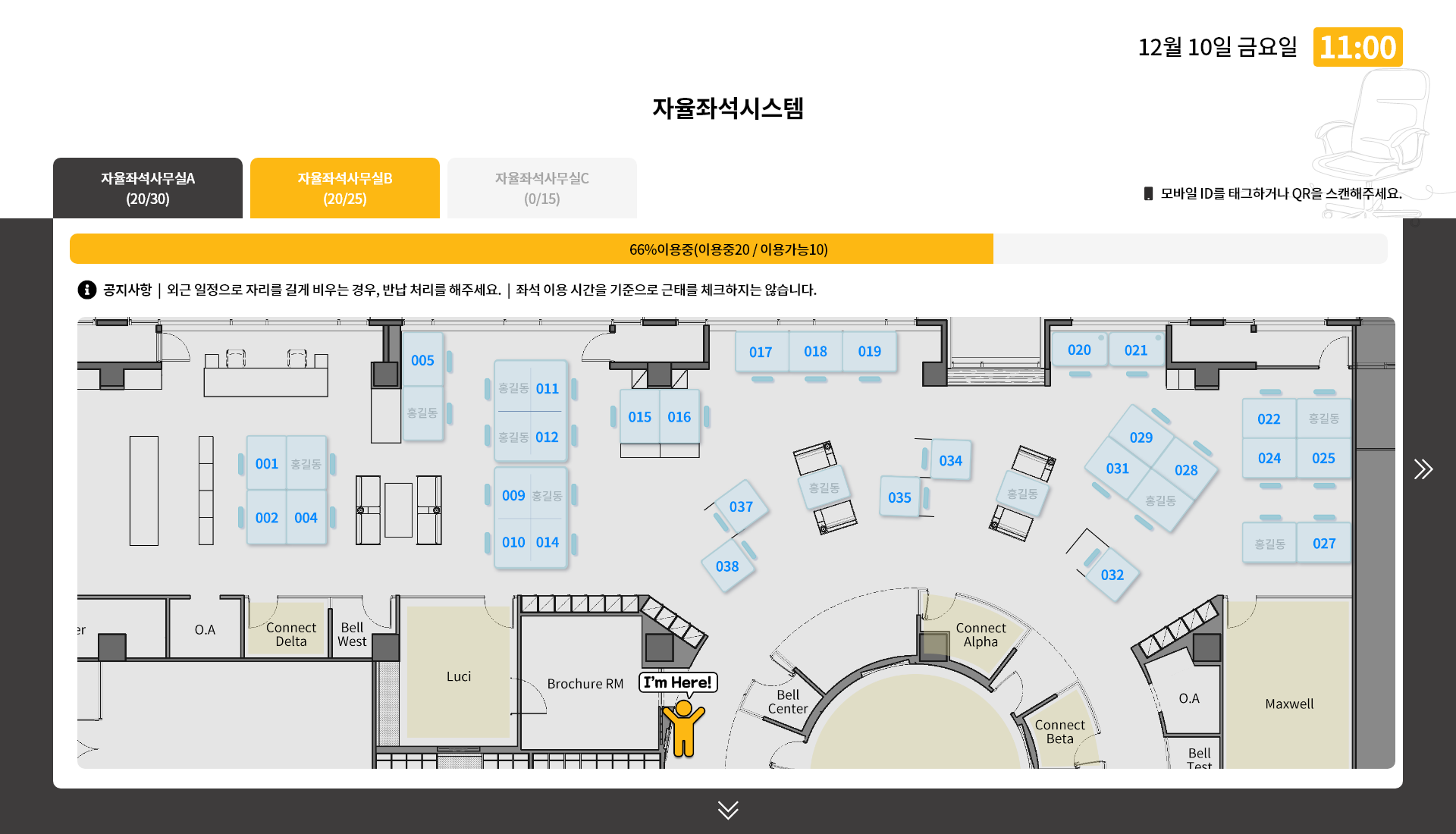 빈 좌석인 경우에는 QR코드르 표시해 자리에서 즉시 체크인 할 수 있도록 하고